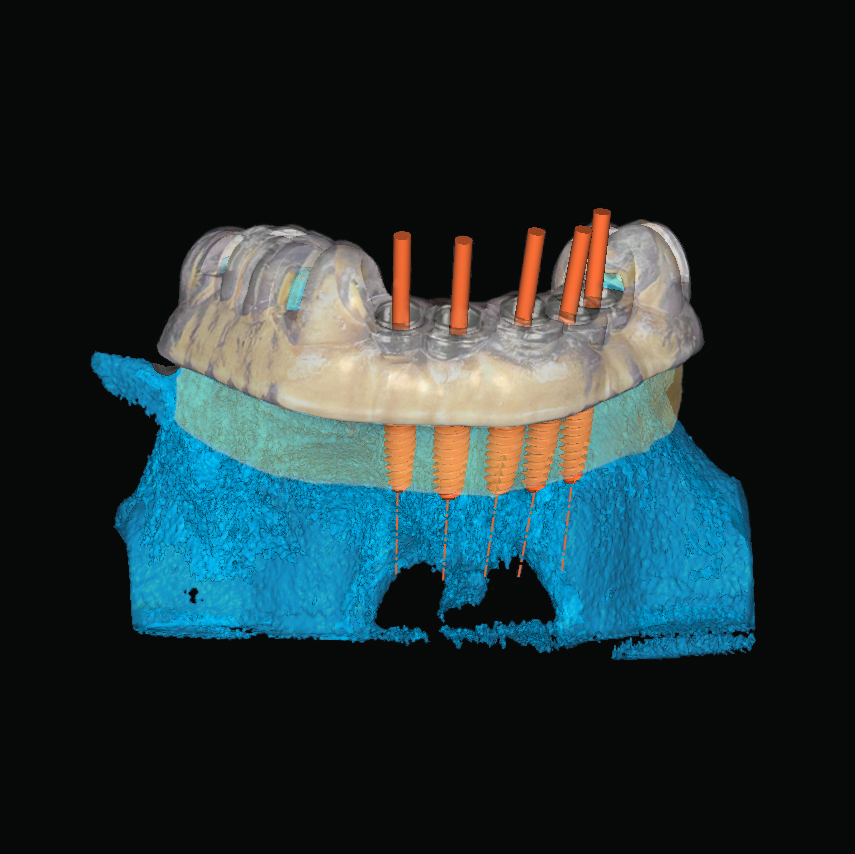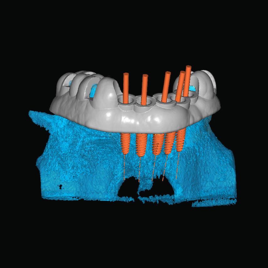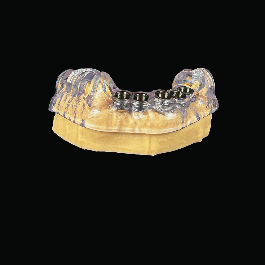 Debido a que somos un laboratorio dental con más de 35 años de experiencia en rehabilitación oral partimos del diseño de la prótesis final ideal con el fin de aplicar los conceptos de la ingeniería inversa y poder visualizar en todo momento las consecuencias estéticas y funcionales de la colocación de los implantes.